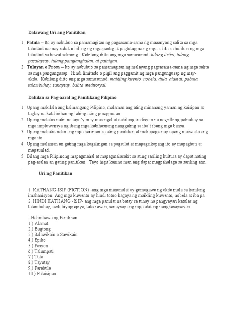 PANITIKAN Ang salitang ito ay tinatawag ding literatura literature. Tuluyan o Prosa nasusulat sa karaniwang takbo ng mga pangungusap patalata 2. Ano ano ang dalawang uri ng panitikan.