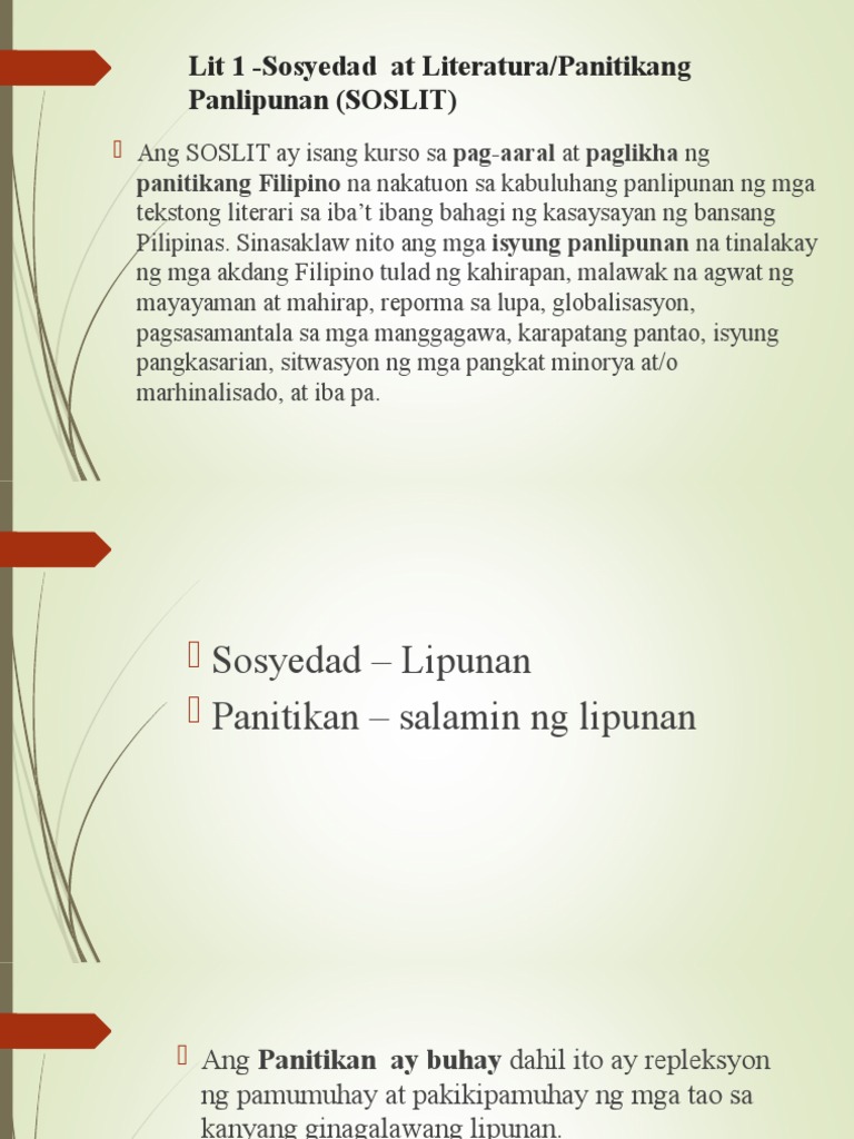 Summary of Sosyedad at Literatura Panitikang Panlipunan SOSLIT Courses. COURSE DESCRIPTION Ang SOSYEDAD AT LITERATURAPANITIKANG PANLIPUNAN ay isang kurso sa pag-aaral at paglikha ng panitikang Filipino na nakatuon sa kabuluhang panlipunan ng mga tekstong literari sa ibat ibang bahagi. Ang magagandang kultura at kaugalian ng ating lahi-Ang kultura ay naiiba sa bawat sulok at salik ng lipunanIbat ibang kasanayan at pag-uugali ang ating kinikilos at ito ay batay sa ating kultura at kaugalian.