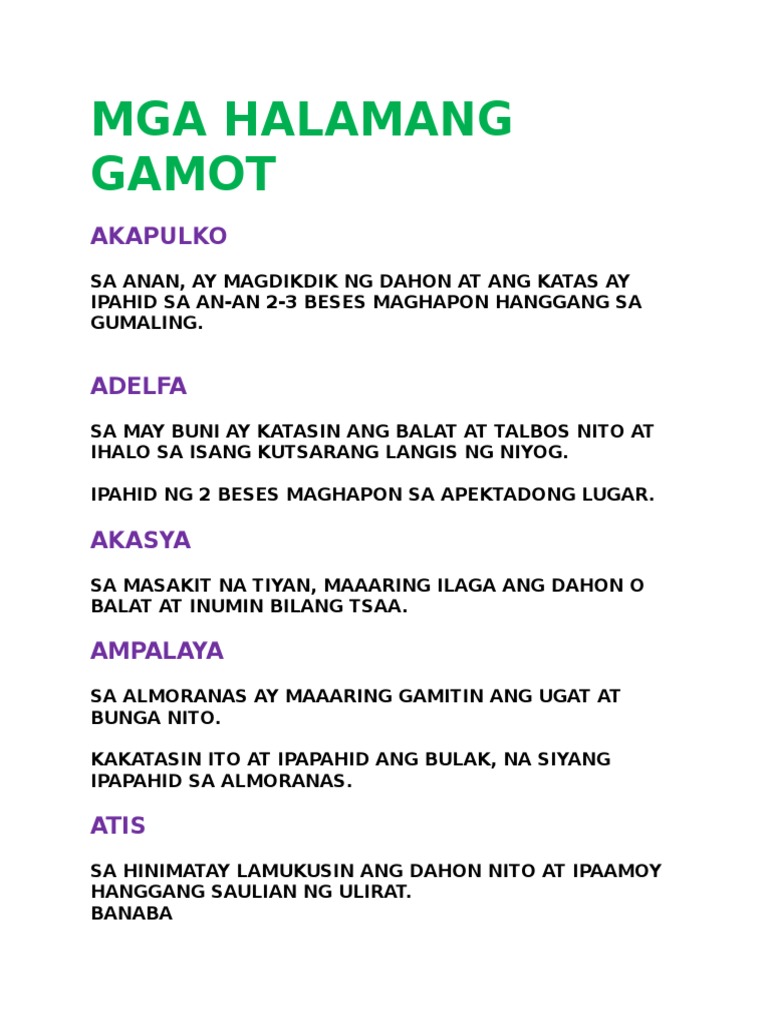 Literatura ng halamang gamot. KATAS NG SABILA Aloe Vera Mainam na gamut sa mga paso burns na gaya ng tilamsik ng mantika. Bumili ng marami ipatuyo at ilagay sa malinis na garapon. Pharmacologist epekto ng mga gamotdroga sa katawan ng tao Palliative Medicine Physician pagbabawas ng paghihirap at pagpapahaba ng buhay ng maysakit na may taning na ang buhay Psychiatrist sakit sa isip kumukuha at nagbibigay-kahulugan sa litrato ngmga bahagi loob halimbawa x- rays Rheumatologist kalamnan kalansay halimbawa.