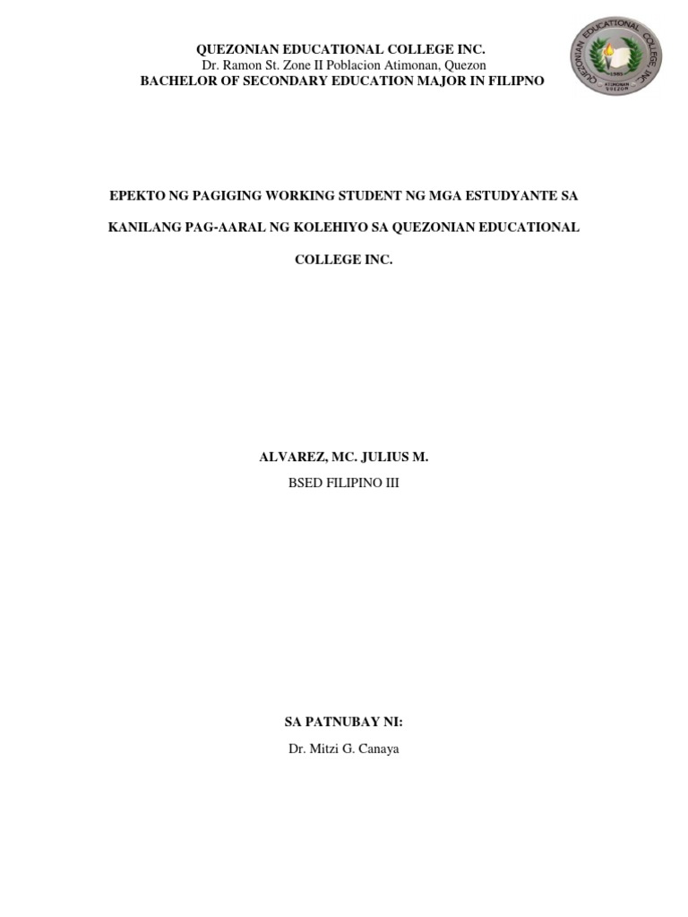 Epekto Ng Pagiging Working Student Ng Mga Estudyante Sa Kanilang Pag Aaral Ng Kolehiyo Sa Quezonian Educational College Inc Pdf